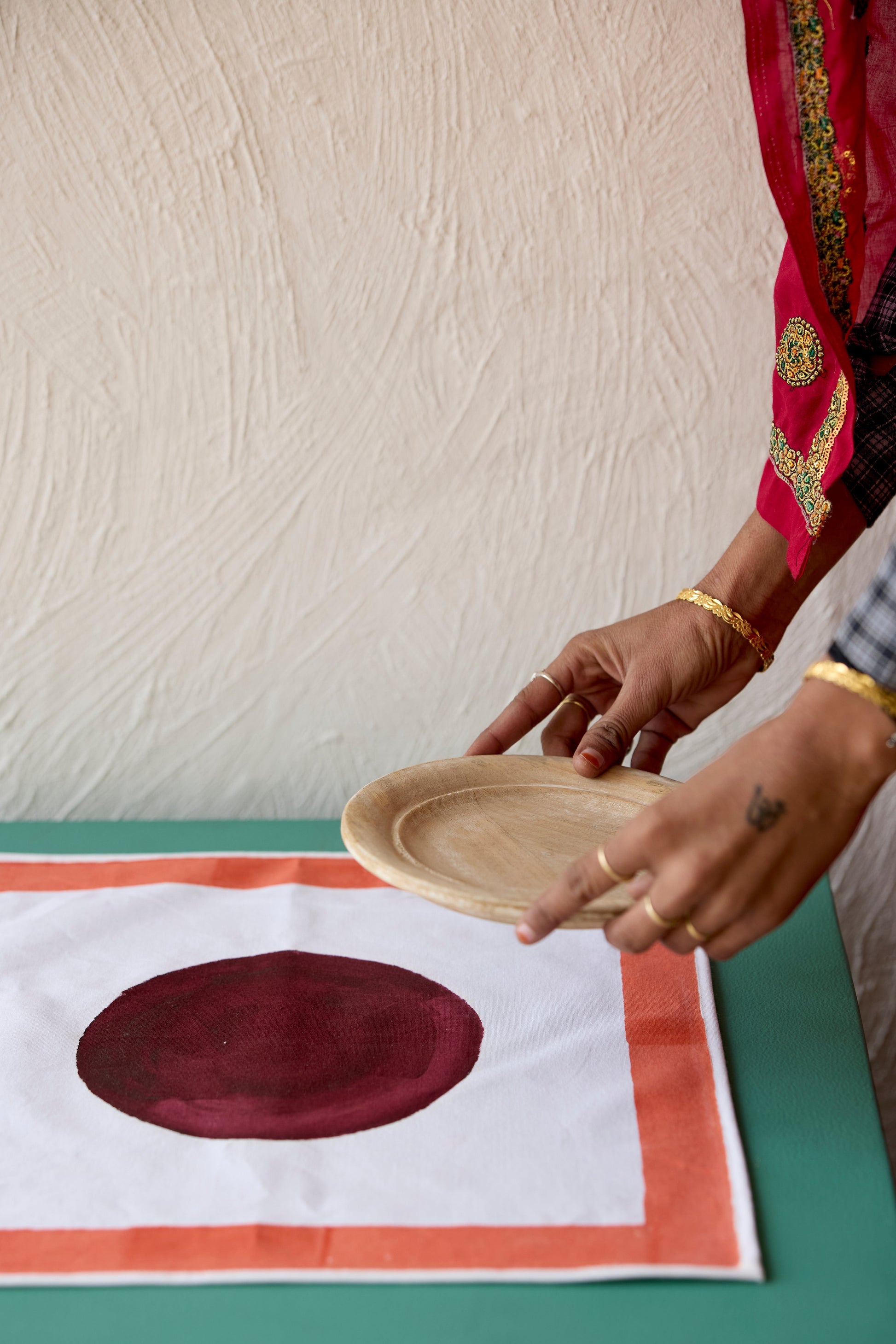 The Bauhaus Placemat Set, inspired by the clean lines and bold geometry of the German Bauhaus Movement, brings timeless modernist design to your table. Featuring a striking red circle framed by vibrant orange borders on a crisp white base, these placemats perfectly blend form and function. Each placemat is lovingly handmade by skilled artisans specializing in wood carving, block printing, Kantha stitching, and dyeing. The design is meticulously hand-pressed onto premium 100% cotton fabric using carved wooden blocks and natural dyes. A traditional Kantha stitch finishes the edges, creating a seamless union of craftsmanship and contemporary aesthetics. Made in small, limited batches, these placemats celebrate individuality and the beauty of handmade artistry. Slight variations in each piece highlight their unique character. Whether for everyday dining or special occasions, the Bauhaus Placemat Set adds a touch of artistic sophistication to your table. - Size: 13" x 18" - Set of 4 or 6 with matching napkins - Machine wash on a gentle cycle with cold water and lay flat to dry - Handmade in India - Designed in and ships from California