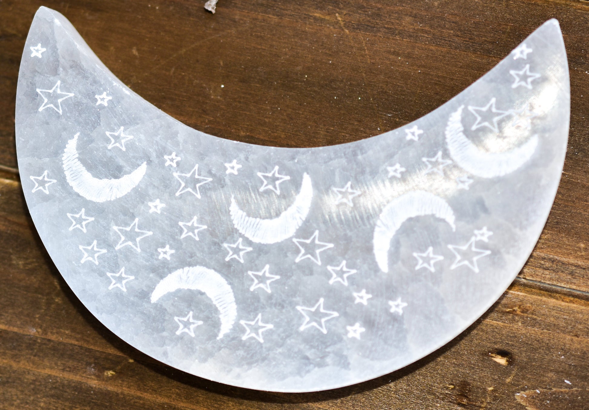 Celestial moons & stars laser engraved on a crescent moon selenite plate! Perfect for charging your smaller crystals and looks great as a display for your jewelry or trinkets.