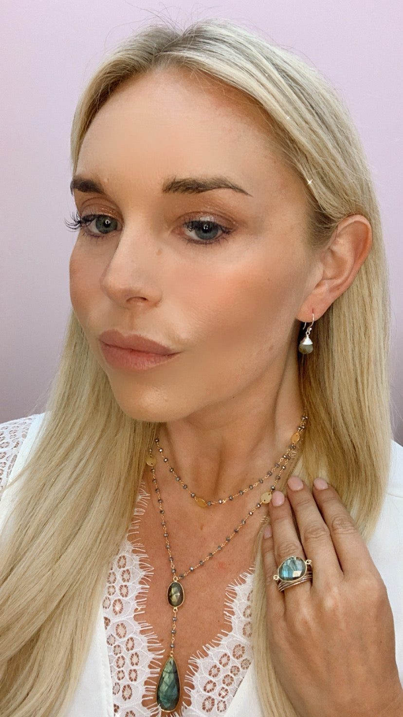 A 16" gold coin and semi-precious polished pyrite beaded chain necklace with a second 17" gold and semi-precious polished beaded chain necklace with a round semi-precious labradorite stone set in a 14k gold vermeil bezel, cascading down to a teardrop-shaped semi-precious labradorite stone pendant set in an 14k gold vermeil bezel.
