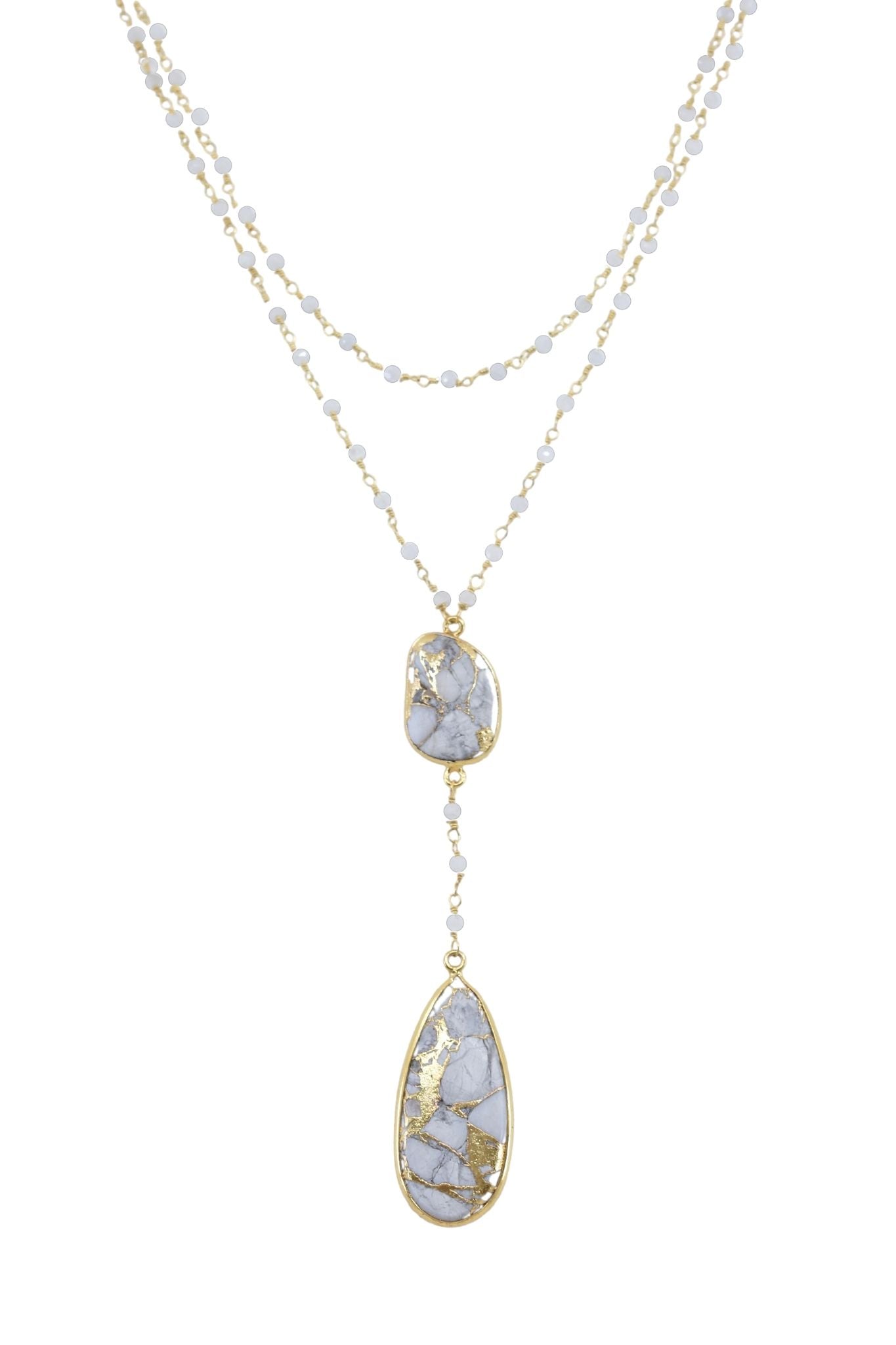 A 16" gold and semi-precious moonstone beaded chain necklace with a second 17" gold and semi-precious moonstone beaded chain necklace with a round semi-precious white mojave copper turquoise stone set in a 14k gold vermeil bezel, cascading down to a teardrop-shaped semi-precious white mojave copper turquoise stone pendant set in an 14k gold vermeil bezel.