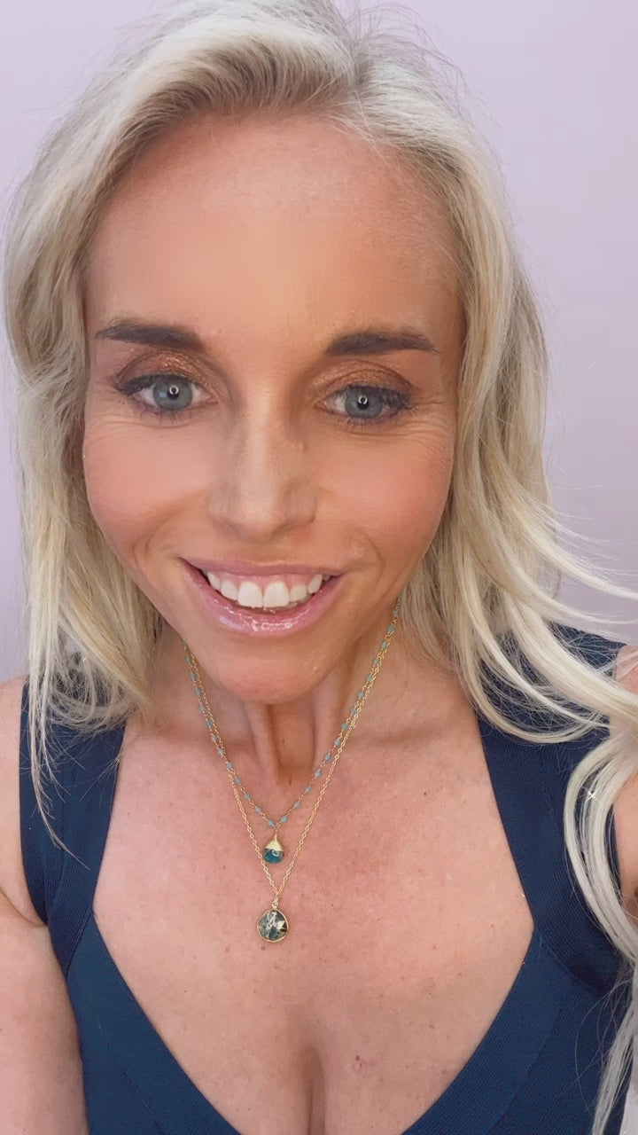 A gold necklace with two strands and a spring ring clasp. One strand has an teal mojave copper turquoise stone set in a 14k gold plated bezel on a classic vermeil chain. The other strand has a teal mojave copper turquoise stone hand-wrapped in vermeil wire on a amazonite beaded chain.