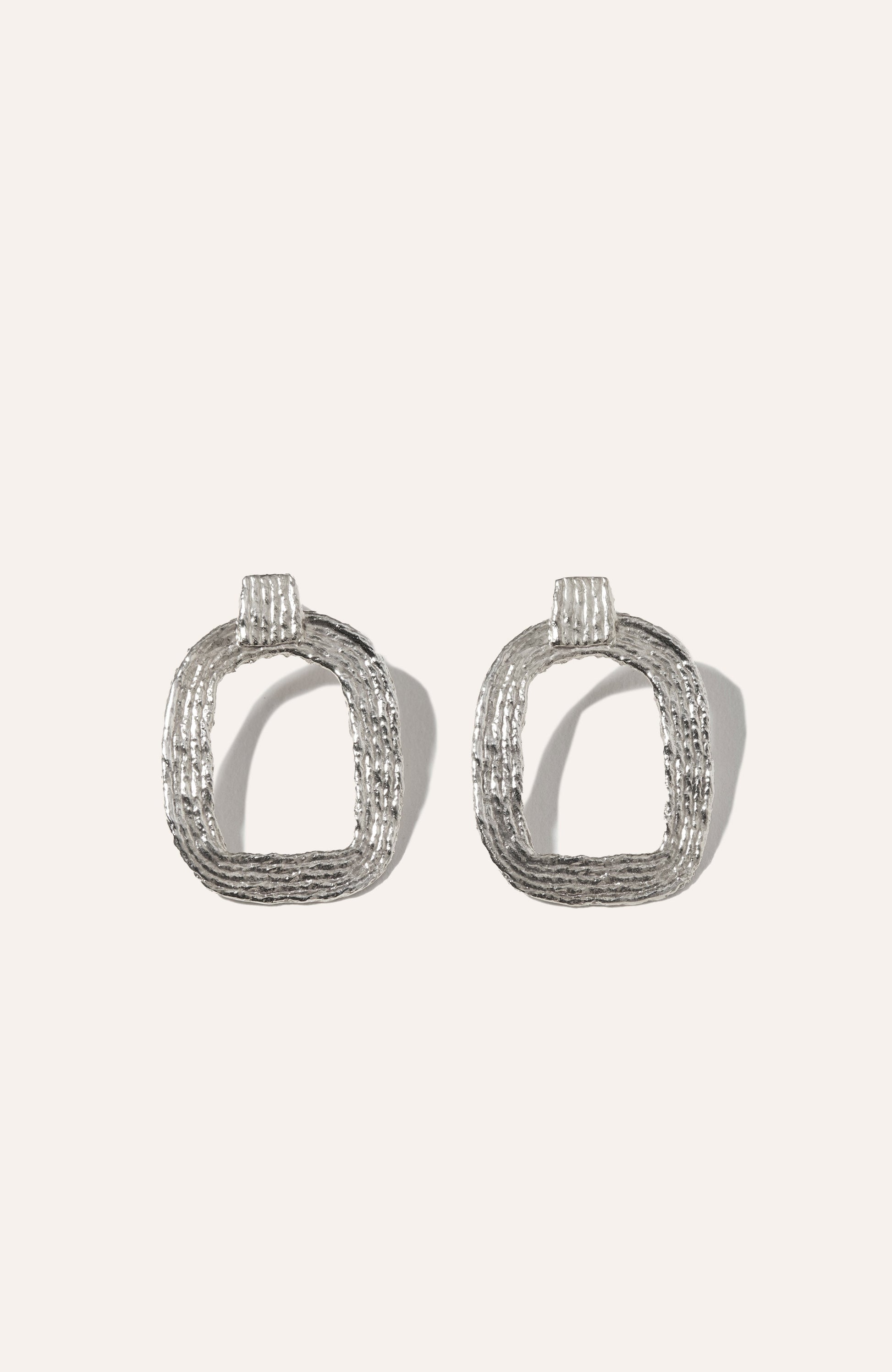 Inspired by the pioneering artist Eva Hesse, the Eva Hoop Earrings are a study in structure and fluidity. Delicate woven cotton threads are expertly cast into metal, forming a bold yet refined design featuring rounded rectangles and a subtle square detail. These modern statement hoops measure 1.375 inches wide by 1 inch long, offering a striking yet wearable silhouette. Available in 14k gold-plated reclaimed brass or solid 925 sterling silver, each pair is made to order in NYC, embodying craftsmanship and artistic influence in every detail.