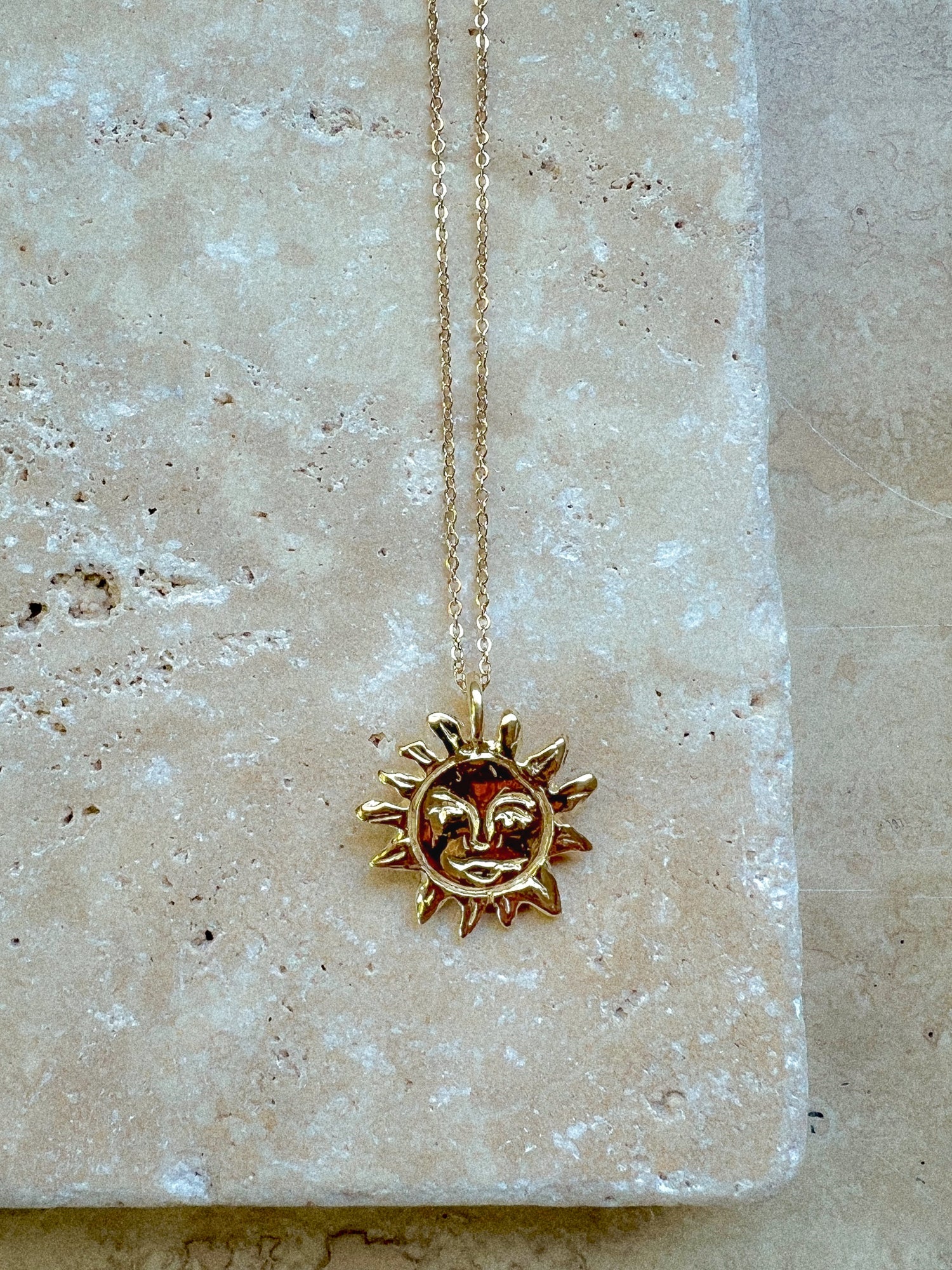 Our Gold Sun Pendant radiates life and energy with its intricately hand carved gold sun face pendant. This timeless sun charm shimmers with divine radiance and will be a source of positivity and a reminder to embrace the light within. Artisan-crafted from recycled brass Hung from a 14k yellow gold-filled 1mm chain measuring 18" long We will be donating a portion of sales of this necklace to the Gaza Sun Birds, a paracycling team that are providing aid to their displaced community in Gaza. Made in California.