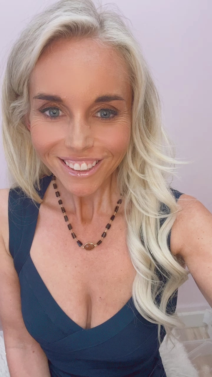 A smoky quartz pendant is set in a 14k gold bezel on a vermeil and smoky quartz stone chain with magnetic clasp closure.