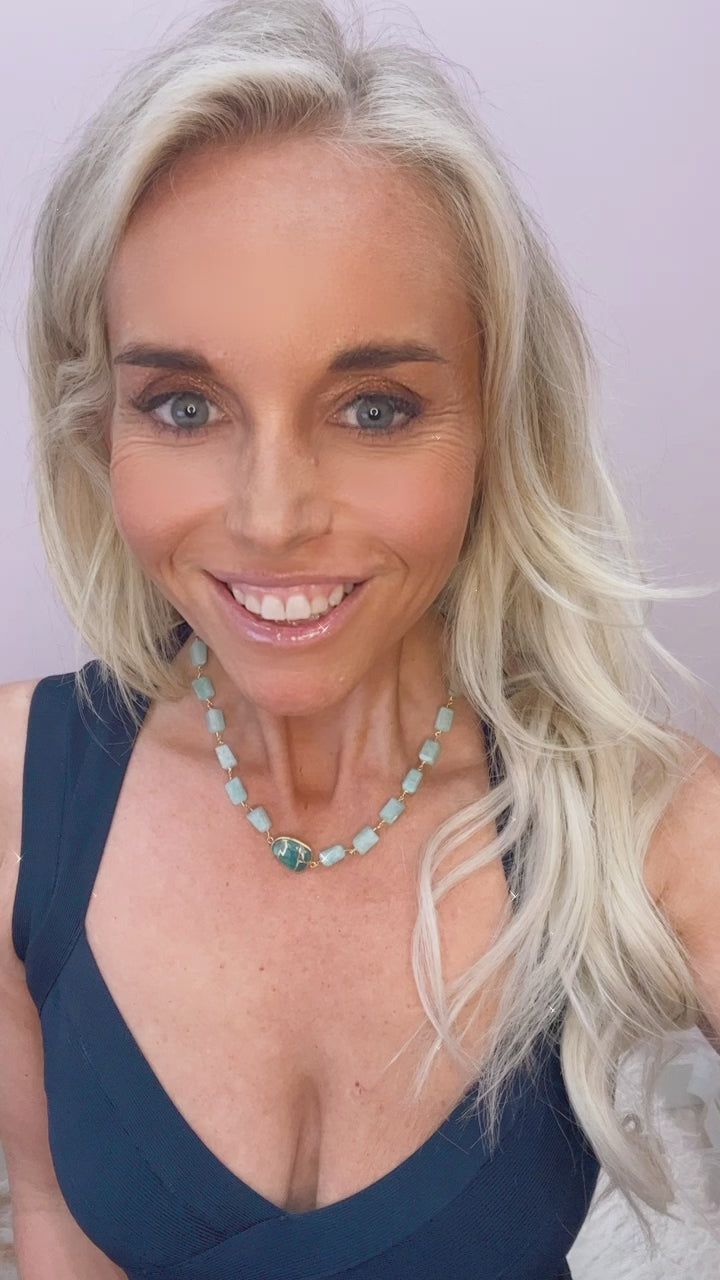 A teal mojave copper turquoise pendant is set in a 14k gold bezel on a vermeil and ruby stone chain with magnetic clasp closure.