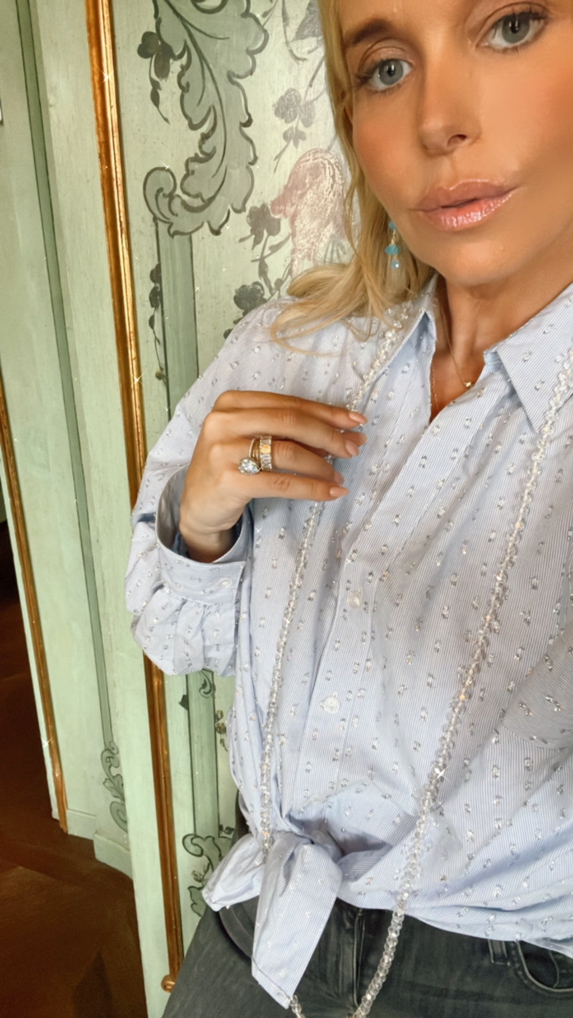 Long necklace beaded with iridescent clear crystals with decorative knots used to space out each bead.