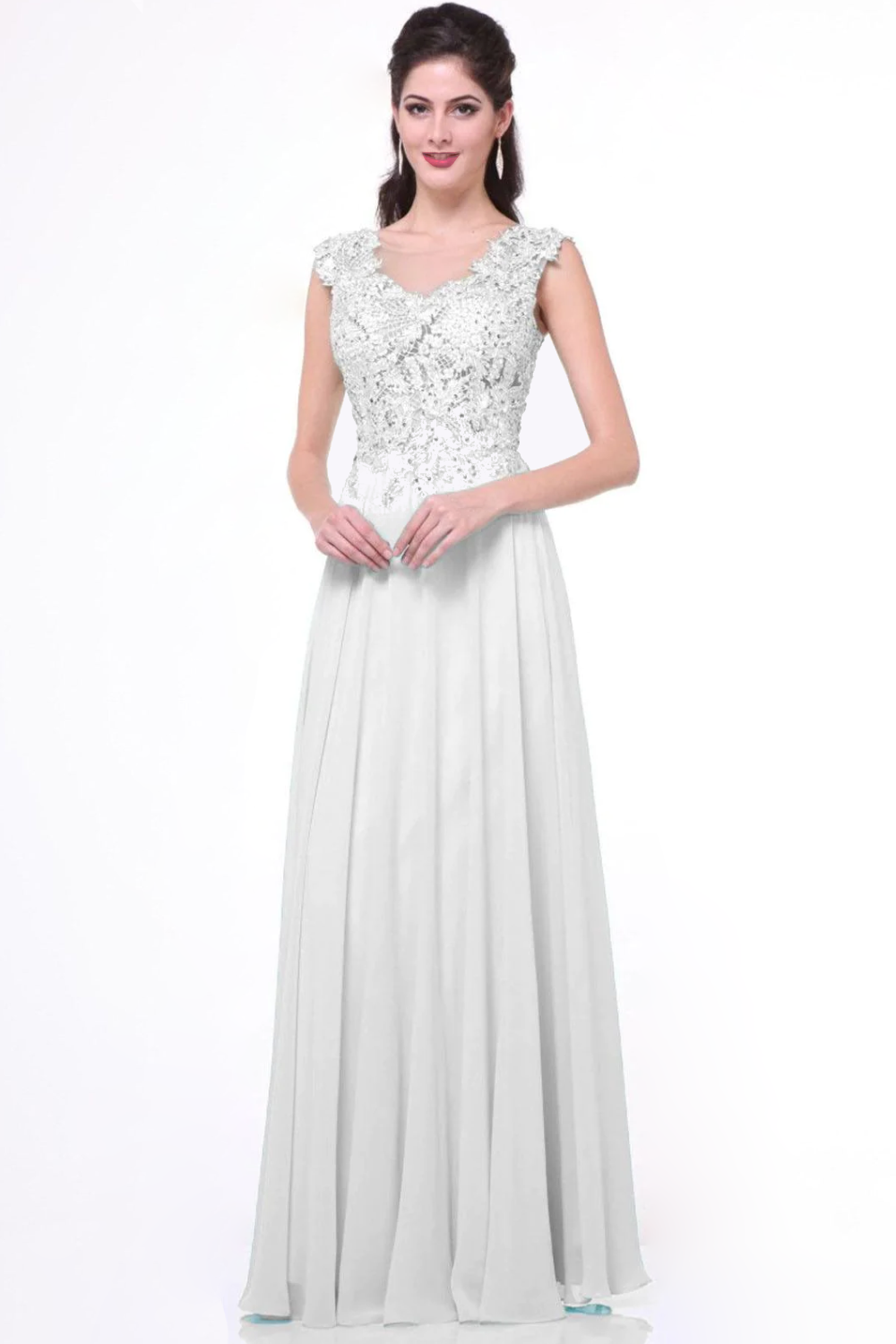 This sleeveless a-line dress features an illusion yoke with a high round neckline, delicate lace appliques, and sparkling jewels on the bodice. The layered A-line chiffon skirt gives it a feminine look perfect for evening events.