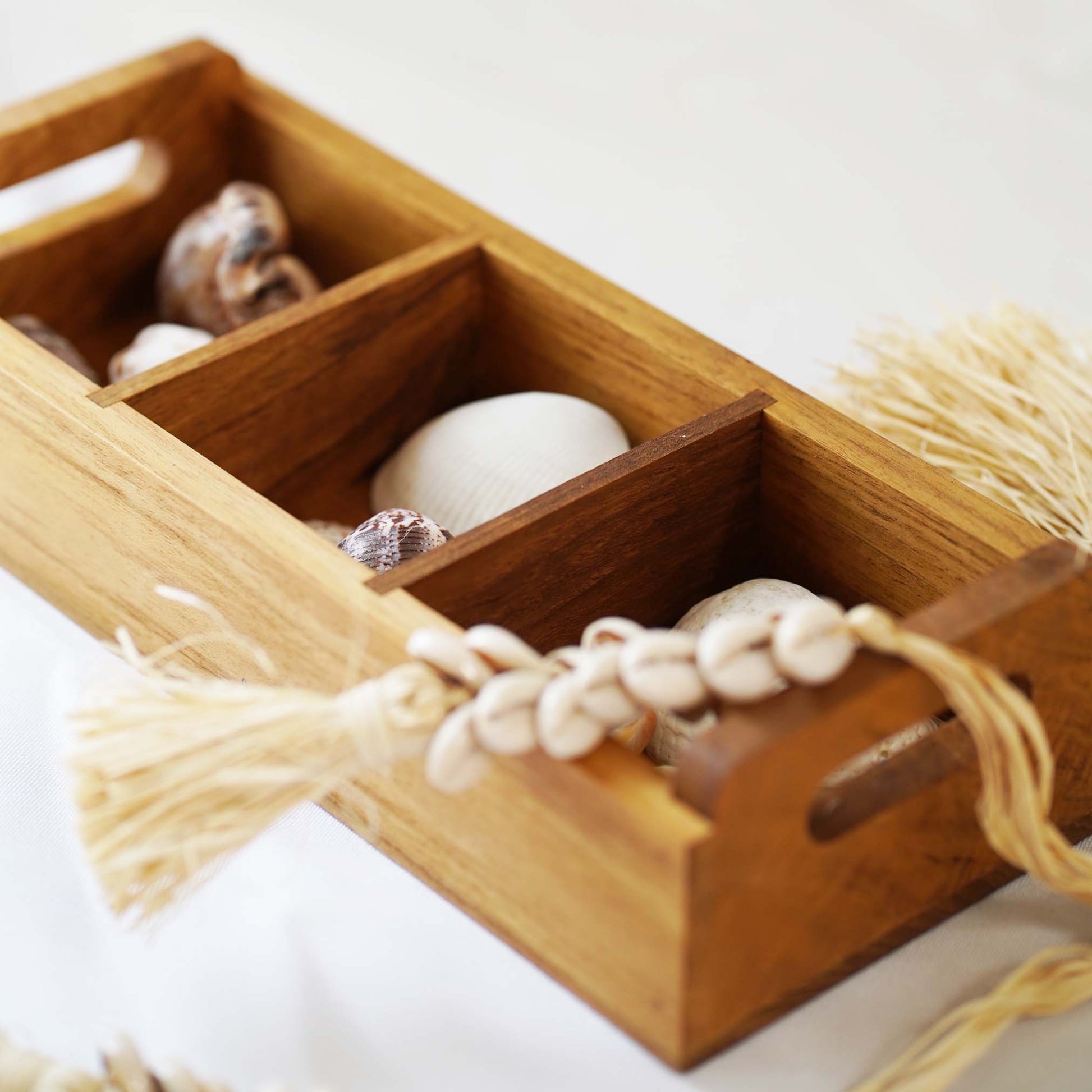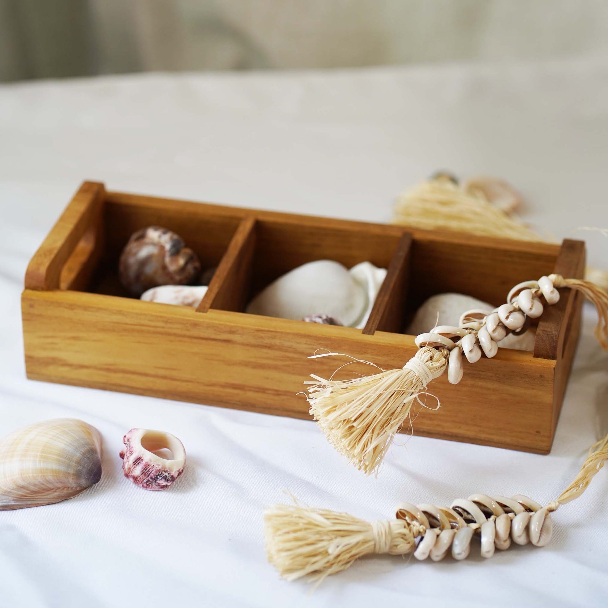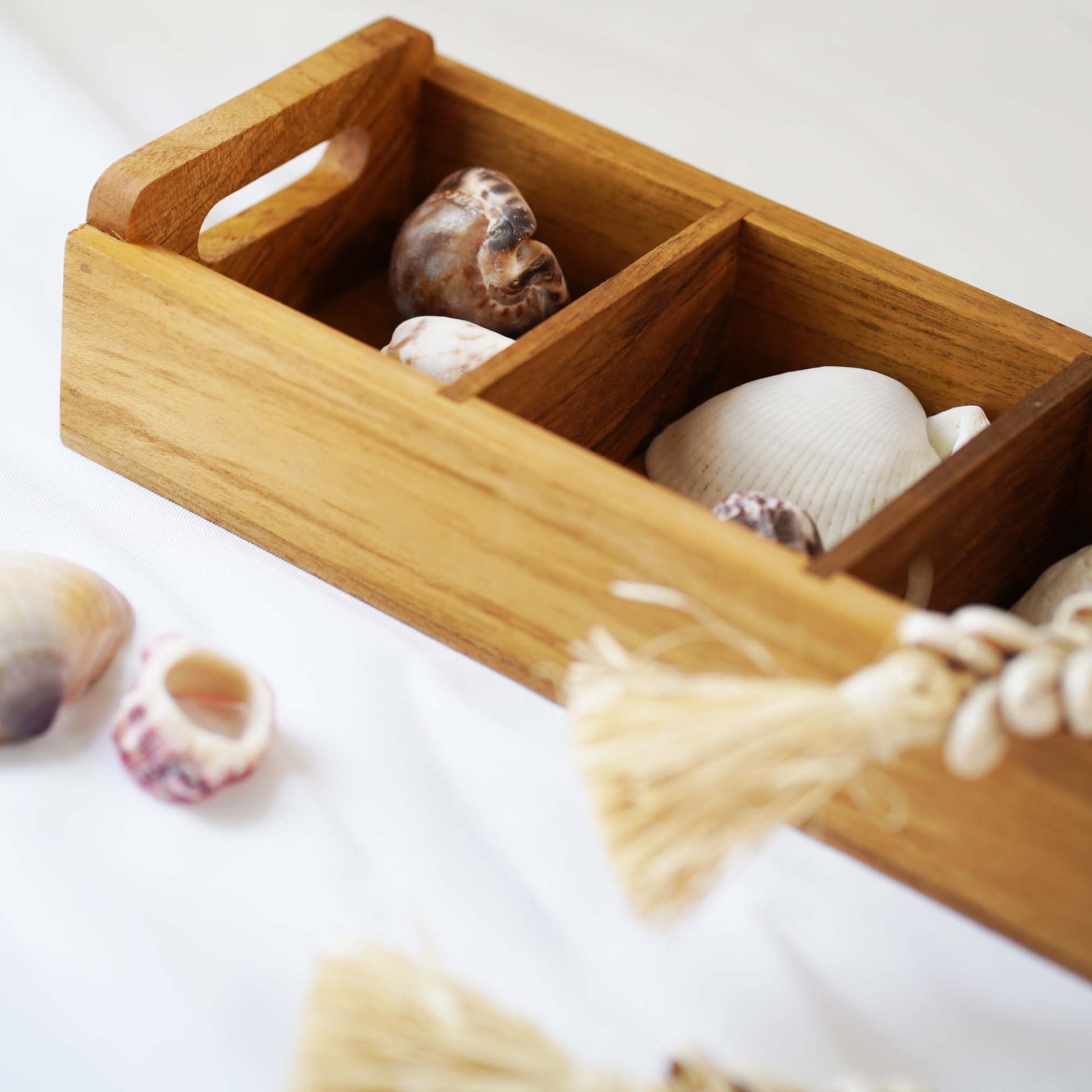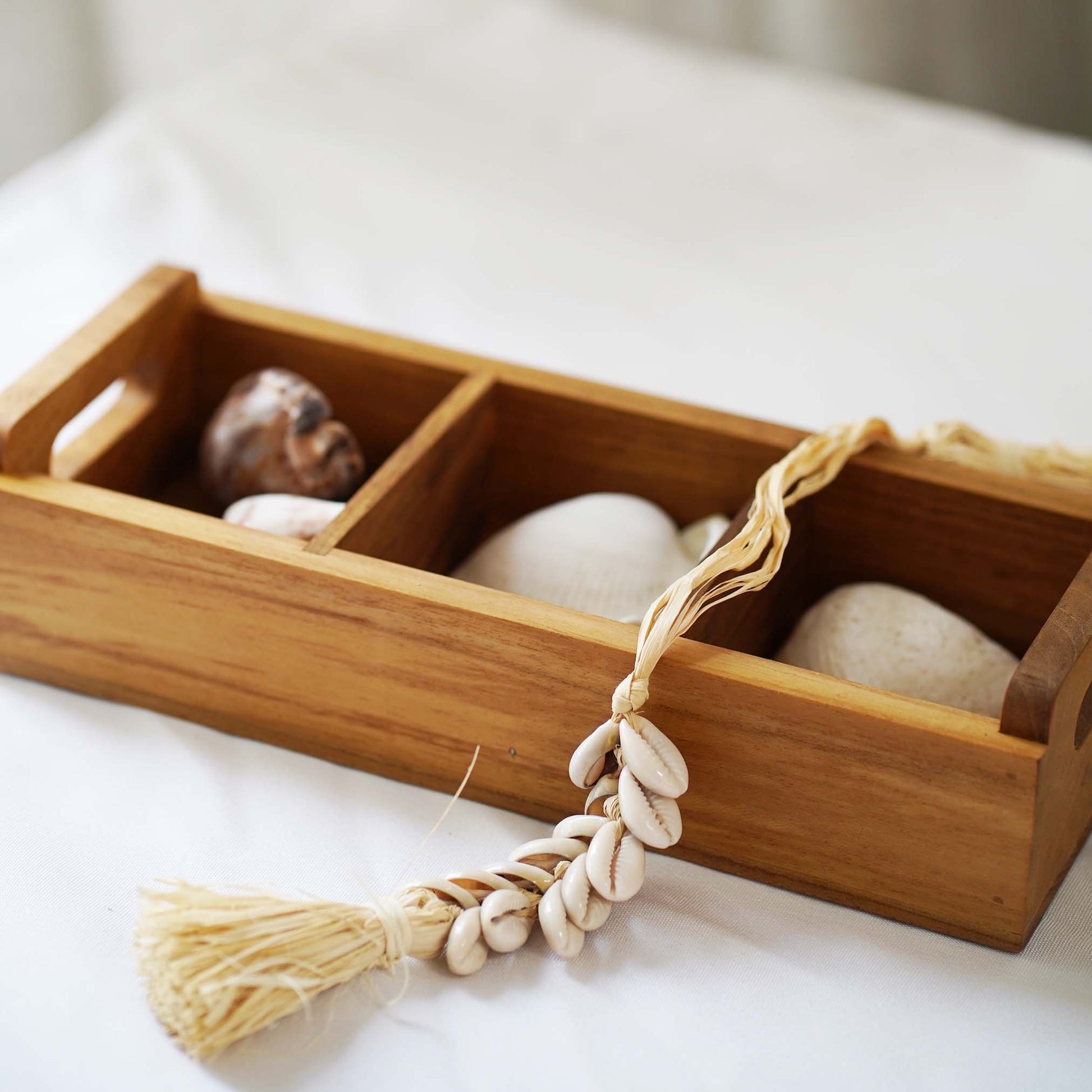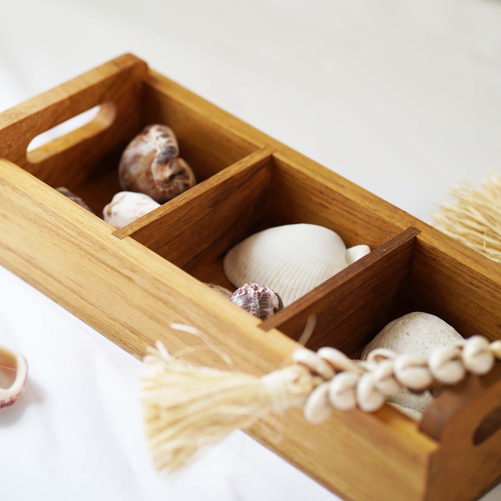 Handmade teak wood rectangle sugar tray made by artisans in Indonesia. Teak wood has natural oil and rubber that makes it perfect and long lasting for kitchenware. This tray would be perfect for storing tea, coffee, sugar. Size: 9.4 inches long x 4.1 inches wide x 2.16 inches height with 3 Partition Teak wood is native to the tropics and is very commonly found in Southeast Asia and especially in Indonesia. Teak wood is one of the most valued and most expensive compared to other woods, such as acacia, pine or oak. Teak wood has high amount of natural oil and rubber and is more weather-resistant than other woods. This is why you'll find teak wood more commonly used as outdoor furniture or kitchenware.