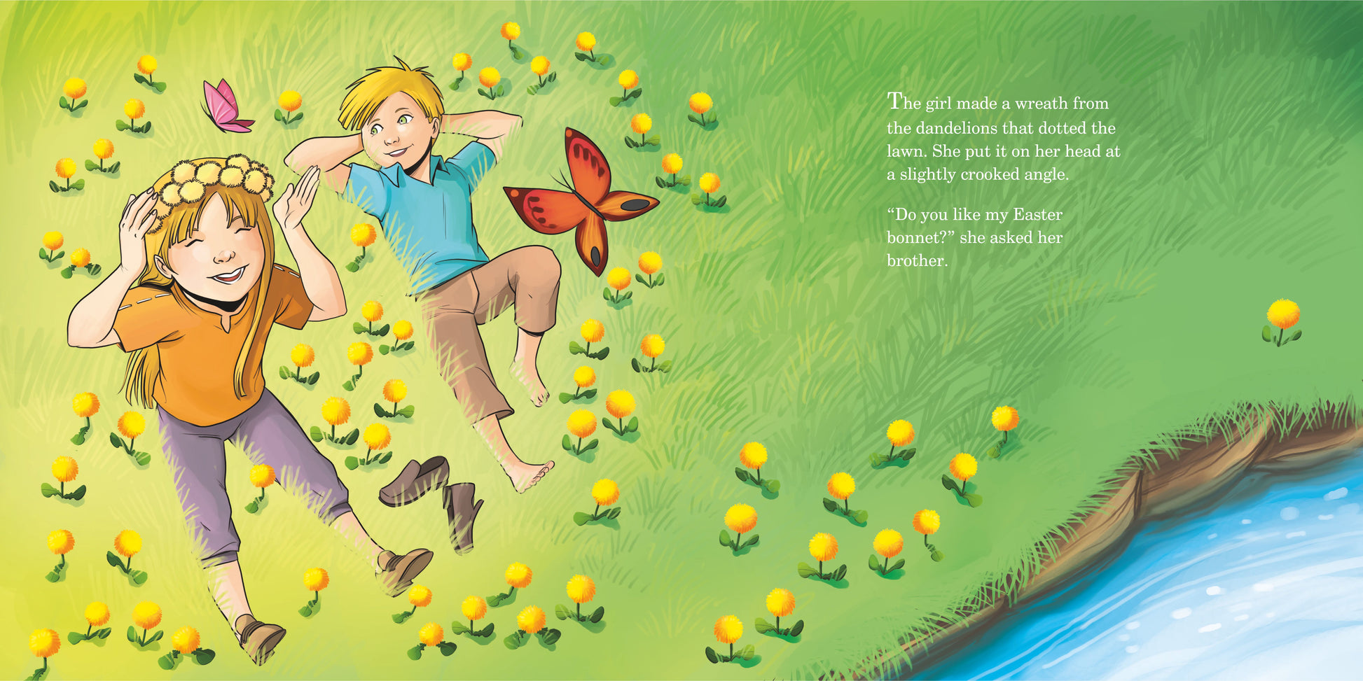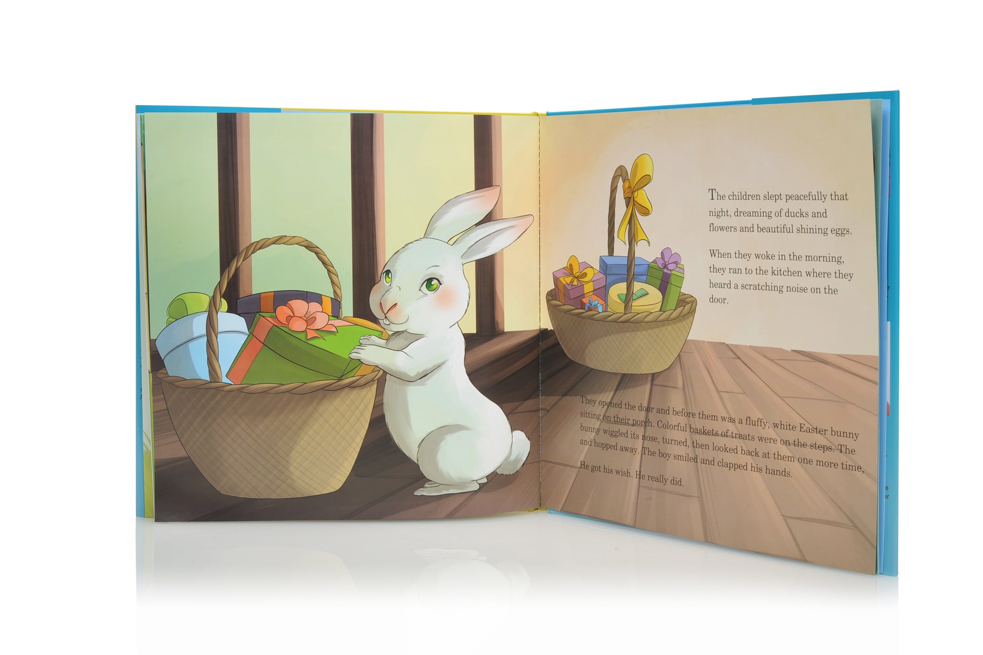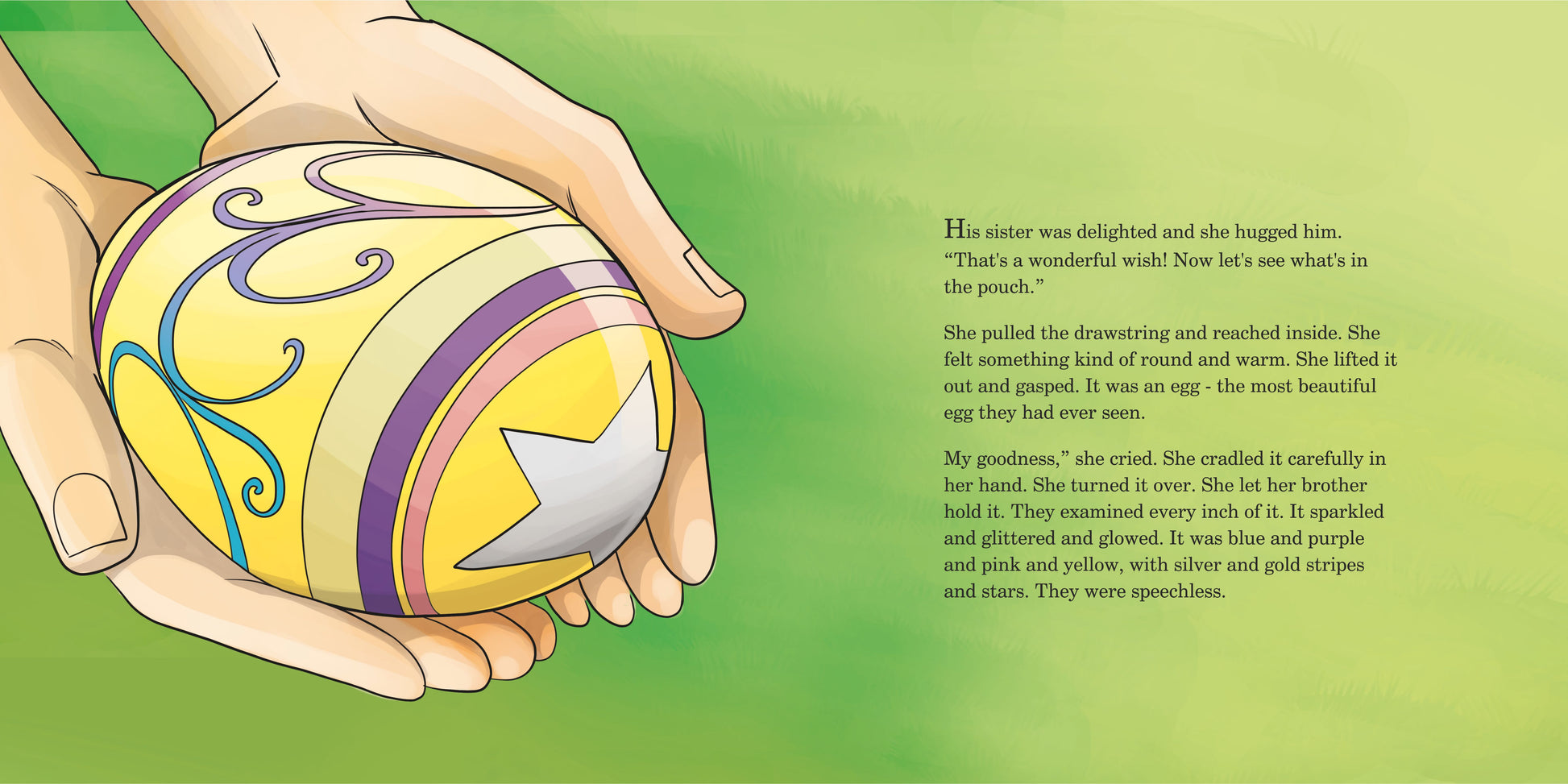 When a little boy and his sister go into the woods behind their cottage, they discover treasures awaiting them. They fill their baskets with acorns and pine cones, flowers and a birds nest. Nearly finished, their baskets overflowing, they spot a yellow pouch on the ground, Inside the pouch is a beautiful Easter egg full of a magical dust. Maybe, if they just wish hard enough, they would get to see the Easter Bunny..