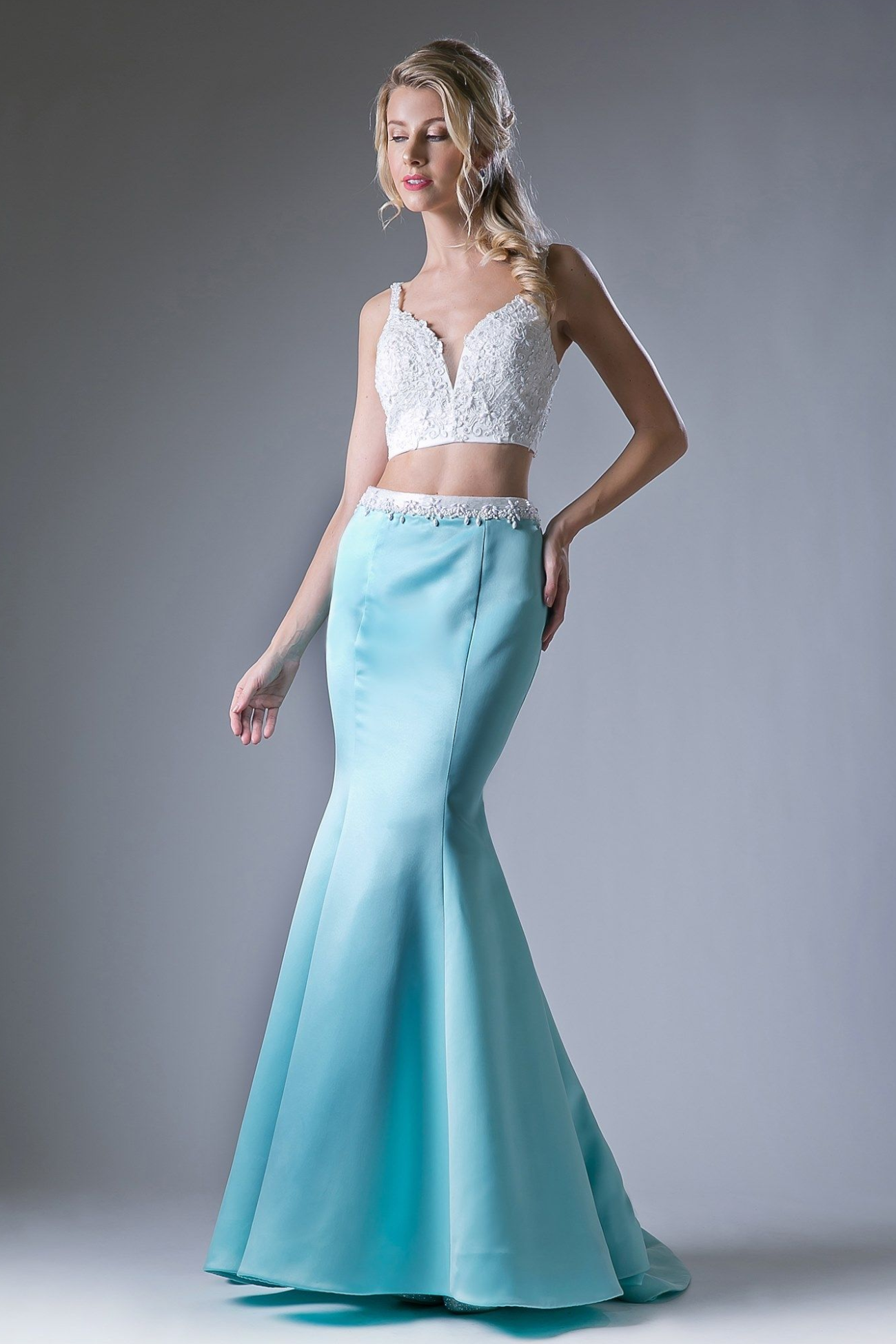 Look like a modern-day mermaid in this glamorous two-piece long gown. Top is embroidered and features a plunging neck with a sheer panel. The daring V cut back will transform you into the center of attention.
